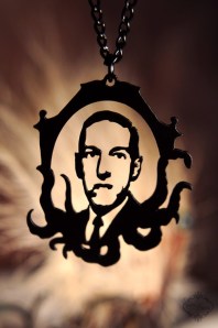 H. P. Lovecraft Cthulhu necklace in black stainless steel: “An homage to one of the most influential horror writers of the 20th century, Howard Phillips Lovecraft. This framed silhouette pendant is detailed with sprawling tentacles… a nod to Lovecraft’s cosmic creature, Cthulhu.”