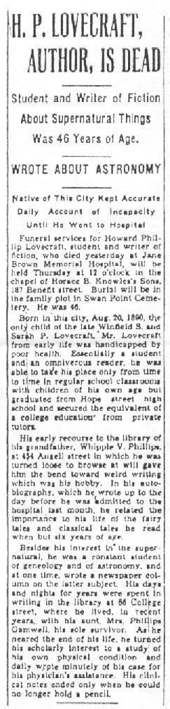 Funeral services for Howard Phillip Lovecraft, student and writer of fiction, who died yesterday at Jane Brown Memorial Hospital, will be held Thursday at 12 o’clock in the chapel of Horace B. Knowles’s Sons, 187 Benefit Street. Burial will be in the family plot in Swan Point Cemetery. He was 46.