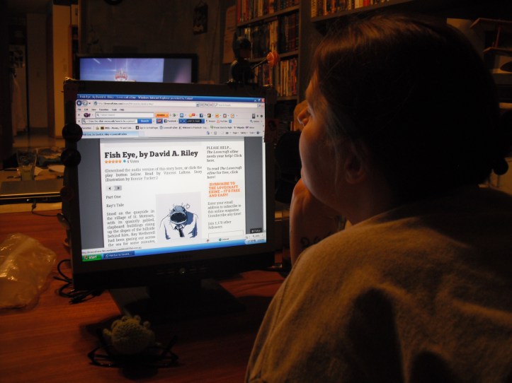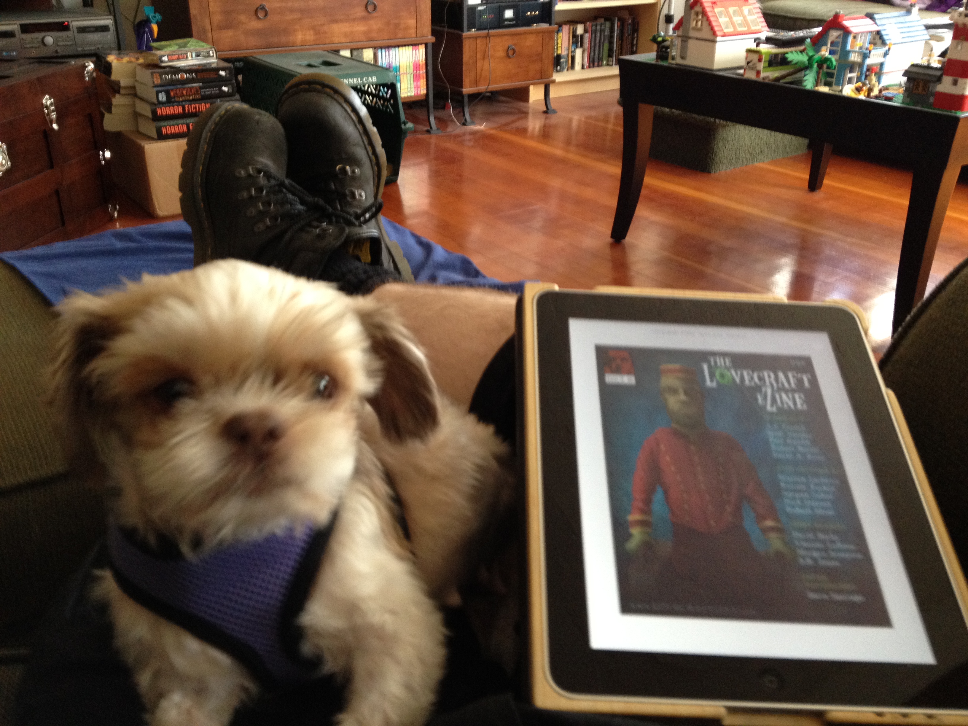 Dominique says: Here’s a picture of me reading the e-zine. In the bottom left you’ll see my Bitty Cthulhu reading too. 😉