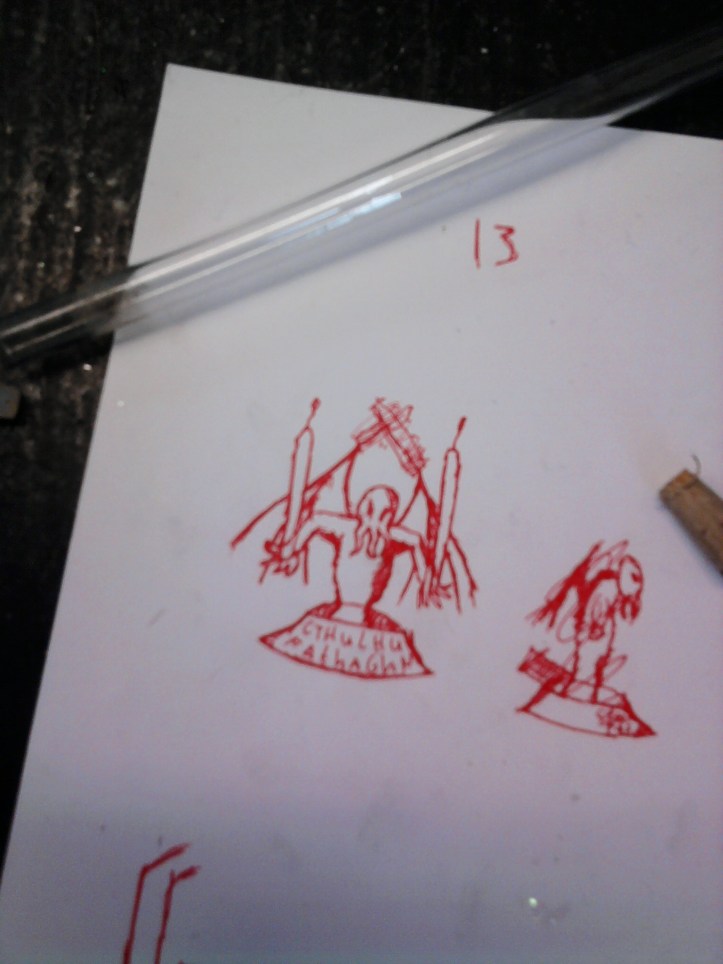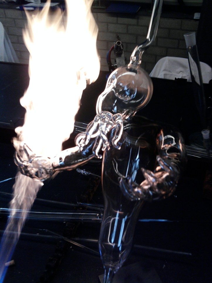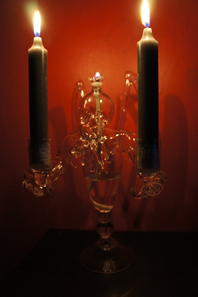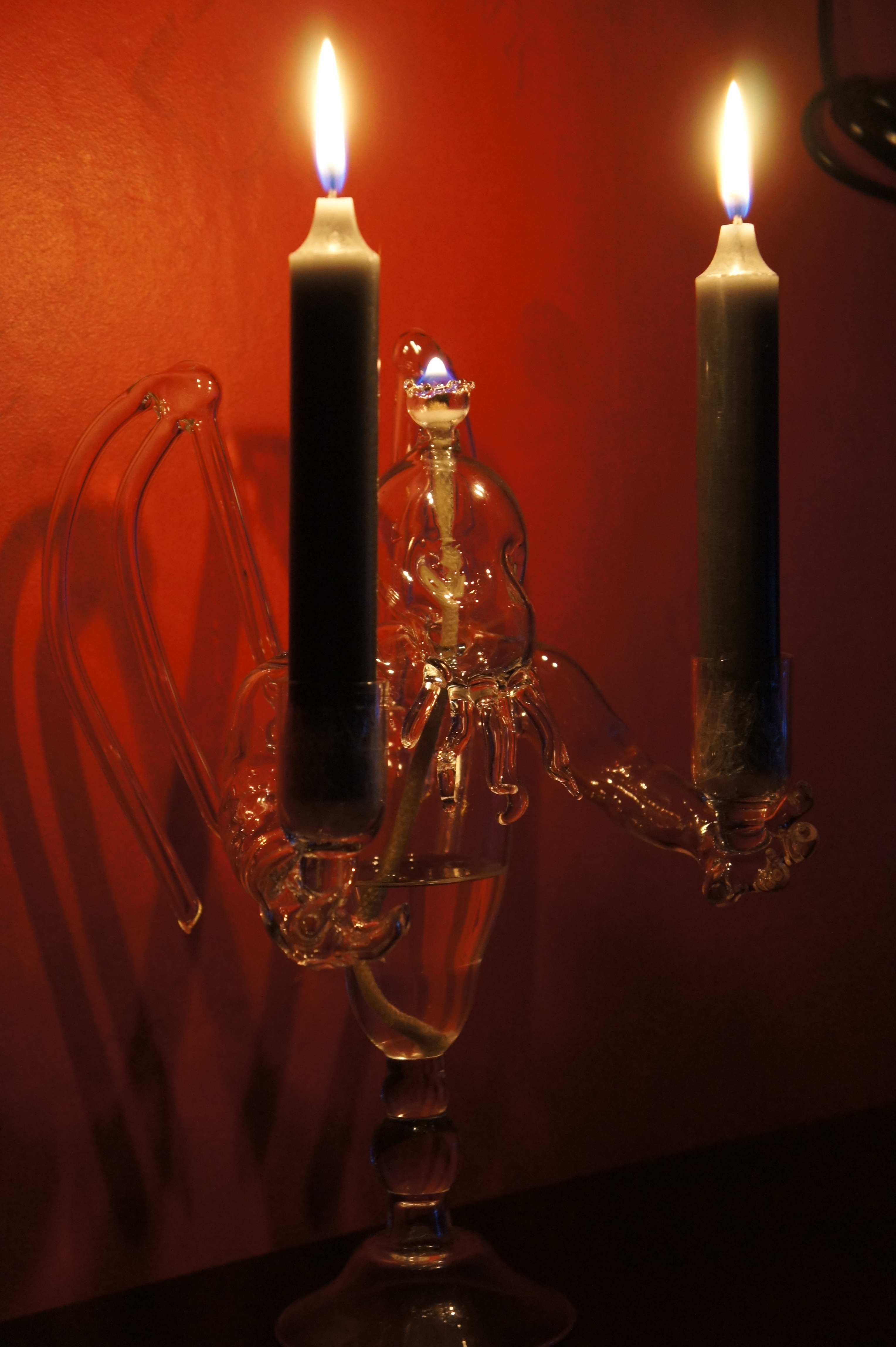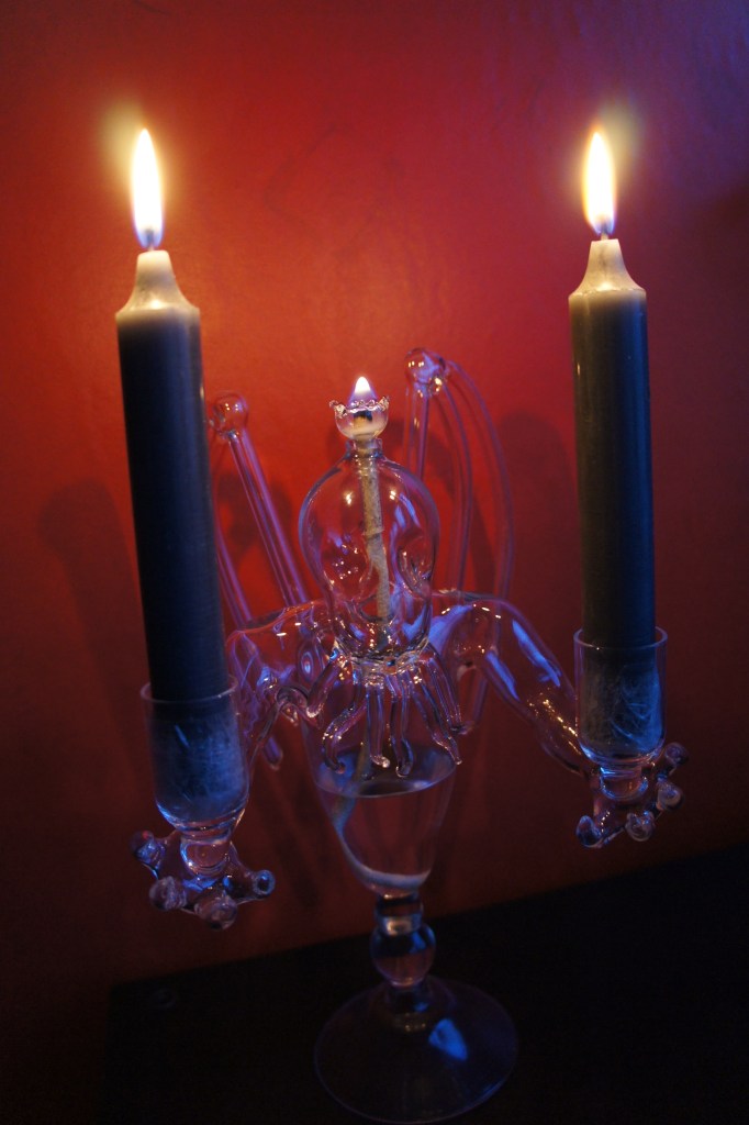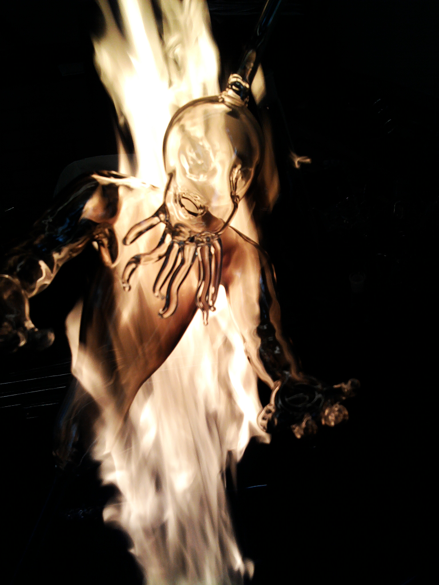 Lately I’ve been finding myself having a little spare time at the glass workshop, so i decided it was time for something massive. So without further ado i present to you, the Cthulhu Candelabrum! It took me around six hours to complete, and i’m very happy with the way it turned out. On the pictures you can see the finished result, some work-in-progress pictures and a quick sketch of the idea. The entire piece is quite heavy, and stands 11.8 inches tall. Cthulhu is hollow on the inside, so halfway of making it i decided i could fill him up with lamp oil and create an oil lamp/Candelabrum combo.