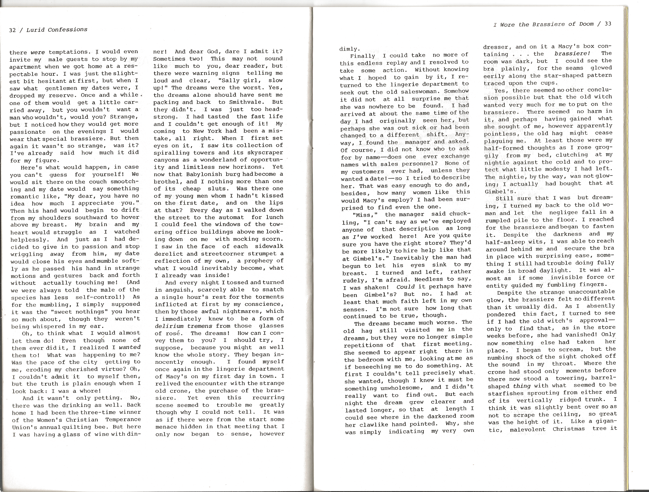 “I Wore the Brassiere of Doom” is a story by “Sally Theobald” (Robert M. Price) in LURID CONFESSIONS #1 (June 1986). It’s an hysterically funny story by Bob which pretends to be a “True Confessions” tale ghosted by H. P. Lovecraft. Enclosed are scans of the story. A French scholar actually accepted Bob’s hoax as genuine, and listed this story in a bibliography of Lovecraft’s works.