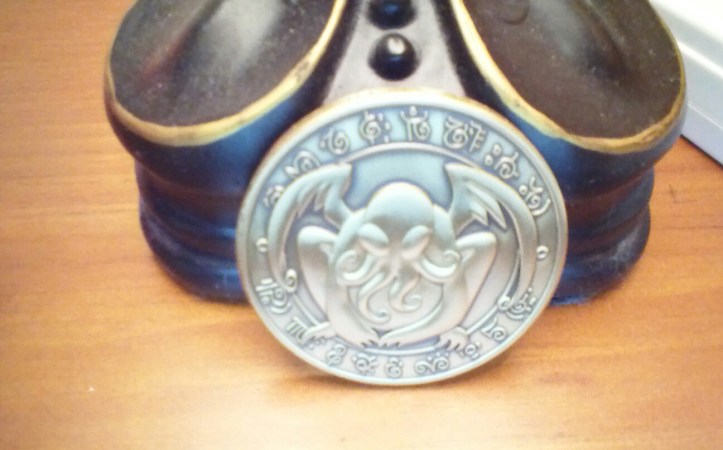 I’m going to give away a print copy of Weirder Shadows Over Innsmouth and a Cthulhu coin (from our friends at Littlest Lovecraft) to two lucky LIVE viewers! For your chance to win, simply watch the show at midnight ET tonight, here.