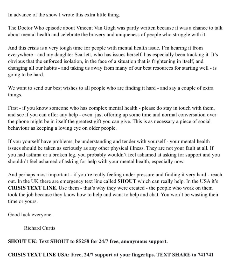 P.S. Vincent and the Doctor was written by Richard Curtis. He writes: