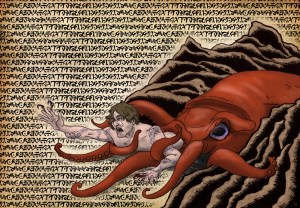 “Look, Doc,” said Nathan Scuyler, sighing as I continued to inspect the tattoo’s ebb and flow, tracing the Laocoön-like sleeve of each arm all the way up to his shoulders. “I teach marine biology at Stanford. My graduate and Ph. D. work was done on Mesonychoteuthis, which in case you didn’t know is the giant squid’s even bigger brother and largest invertebrate on the planet. Eyeballs the size of cantaloupes and a penis you can skip rope with. You want factoids, I have a million of them. Because the plain simple truth of the matter is, ever since I was a kid in Massachusetts and hunted squid by moonlight, I’ve been totally entranced by cephalopods. You put me in the company of anyone who’ll listen, let alone a biologist, sailor or fisherman, and I totally geek out. Fortunately, part of me was able to diffuse this by acquiring the unique artwork you see before you. Cost me a pretty penny at the time, too. But I was also lucky enough to write a well-received book that quite a few libraries, both university and public, wanted for their stacks. In fact, it’s book club money that’s paying for the laser treatments. So you’d think I’d mastered my obsession or at least had partial control over it. But even now, and knowing better, there’ll be times I’m with Sonya when suddenly I’ll start rhapsodizing about some aspect of octopi or squid-dom and she’ll give me this withering look like she just caught me sneaking a look at another woman’s ass.”