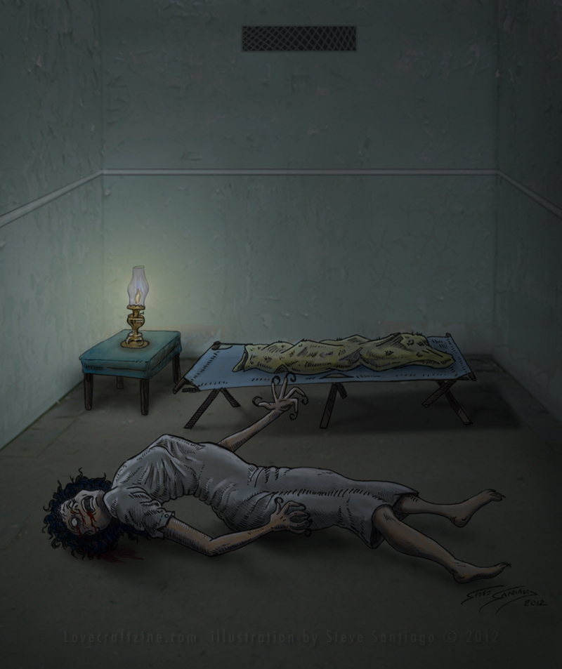 “Miss? Miss, are you alright?”  She gave no response for several moments.  Then suddenly, a tremor shuddered her body.  It was a rapid and most unnaturally quick convulsion, like the twitch of a cat’s tail while watching a bird from a window.  It is impossible for words to convey the horror of this movement.  It was as rapid as the flicker of a candle flame, and while her general posture remained mainly unchanged, the violence of the movement brought her young body a few inches off the floor from the waist up.  “Help!  Is someone there to help?” I called down the hall, but there was no reply.  I called again, yelling quite loudly, toward the steps hoping that some attendant on a smoking break might hear me, but oddly I could no longer make out the stairs in the dim light.  I tried the door to the cell, but it was locked heavily.