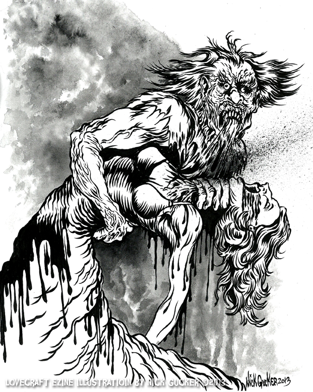 I screamed in outraged denial and was greeted by the sudden movement of another shape in the room, which as the lamp flickered back on was revealed as two figures, one clasped by the other. That the woman was dead was not in doubt, for she was held so tightly about her neck that if she had not died from asphyxiation, she surely had died from trauma to her spine or those fragile arteries that supply blood to the brain. The claws that clamped about her tender throat were pale monstrous things with broken nails caked with blood and filth. As I watched, the face of the beast rose up from behind the dead woman. There was a horrid ripping sound and the woman’s head fell forward as the monster’s own head jerked backwards, tendrils of bloody flesh and chunks of bone clenched between its teeth. It saw me then and I saw it for what it truly was. It dropped that poor woman, casting her aside as one would casually dispose of an apple core, and crouched back. It leapt through the air and I fired my revolver, hitting it squarely in the chest, all the time screaming and cursing the name of the man who had so obviously unleashed this monstrosity.