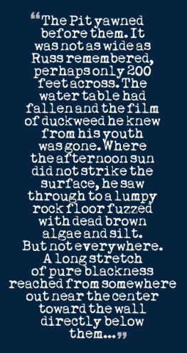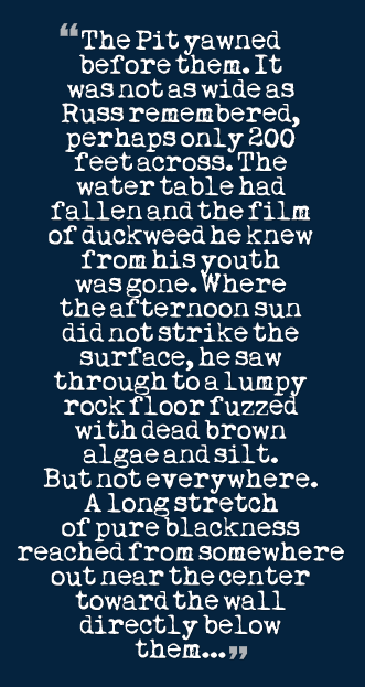 The Pit yawned before them. It was not as wide as Russ remembered, perhaps only 200 feet across. The water table had fallen and the film of duckweed he knew from his youth was gone. Where the afternoon sun did not strike the surface, he saw through to a lumpy rock floor fuzzed with dead brown algae and silt. But not everywhere. A long stretch of pure blackness reached from somewhere out near the center toward the wall directly below them. The breach, no doubt.