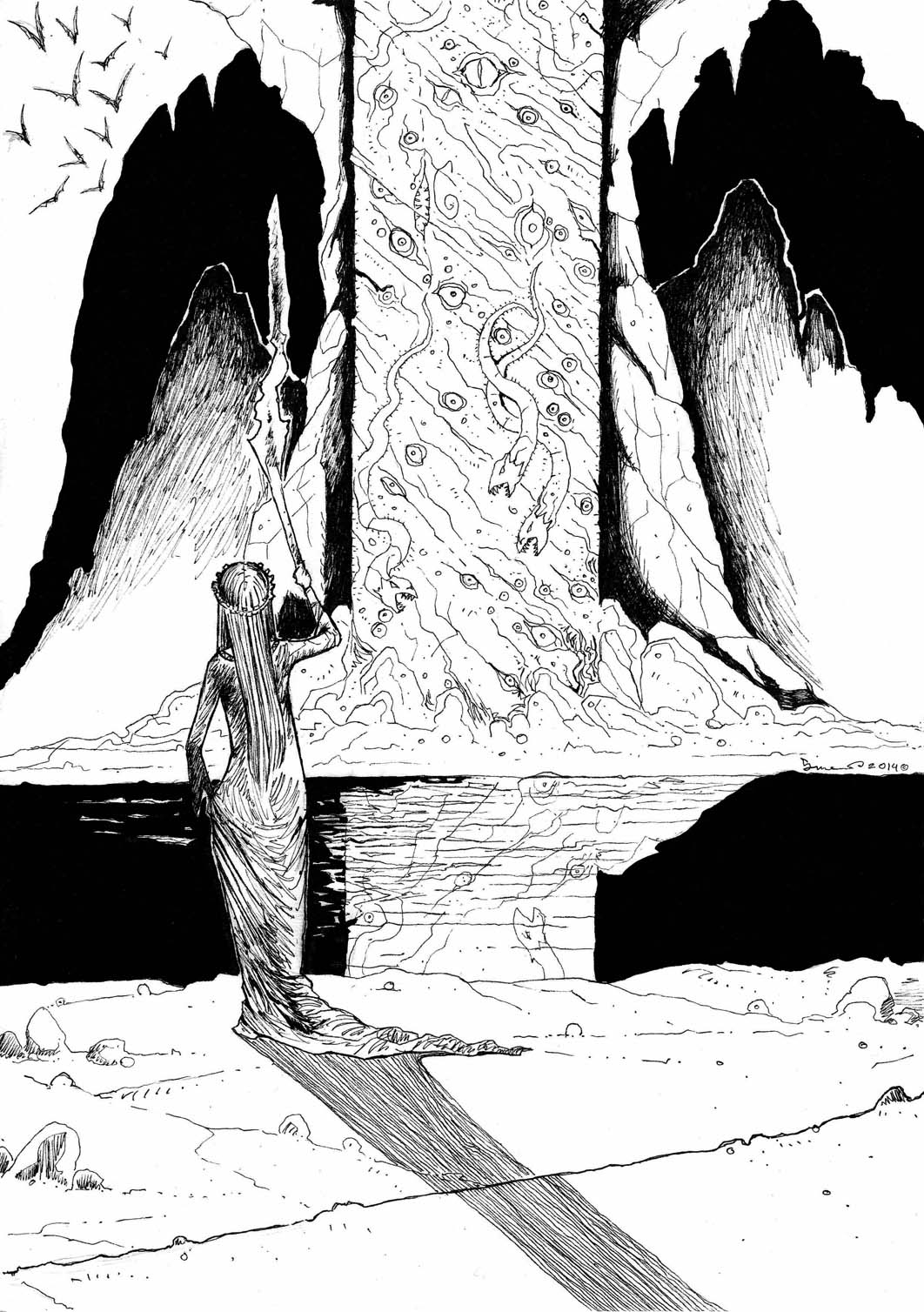 Ayanna entered the cave and walked to the edge of the water, holding out her torch. Rising out of the middle of that foul, black water was an enormous white monolith. It was covered in the same loathsome hieroglyphs—fish, eels and octopus of the normal and nightmarish varieties, as well as the same abhorrent sea-monsters that now plagued their city—as the door at the top of the stairs and the necklaces worn by the dark god himself. It looked like something that was made to be worshiped.