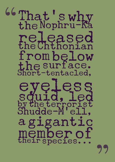 He didn’t remember much after the virus hit, but what he did made him shiver. He had stumbled onto an unusual network out on the Horn. He’d found a chat room with a reference to the Cult of Nophru-Ka. The cult had fled the jungles of Western Africa, and they took with them some of the G’harne Fragments and translations made by important scholars over the years. They’d settled in the Land of Punt on the northern area of the Horn, undisturbed, until we’d arrived, guns blazing. That’s why the Nophru-Ka released the Chthonian from below the surface. Short-tentacled, eyeless squid, led by the terrorist Shudde-M’ell, a gigantic member of their species. The creatures had used their telepathic powers to mentally chain humans in one place so they were easy picking by the insurgents. They had an uncanny ability to mess with our minds if we got too close, to be able to confuse a person so they’d stumble into ambush and be killed.