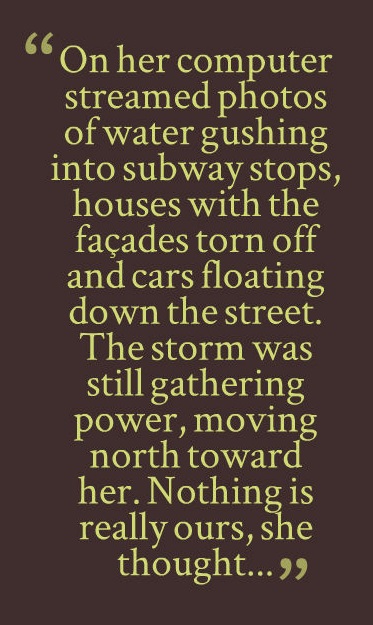 On her computer streamed photos of water gushing into subway stops, houses with the façades torn off and cars floating down the street. The storm was still gathering power, moving north toward her.